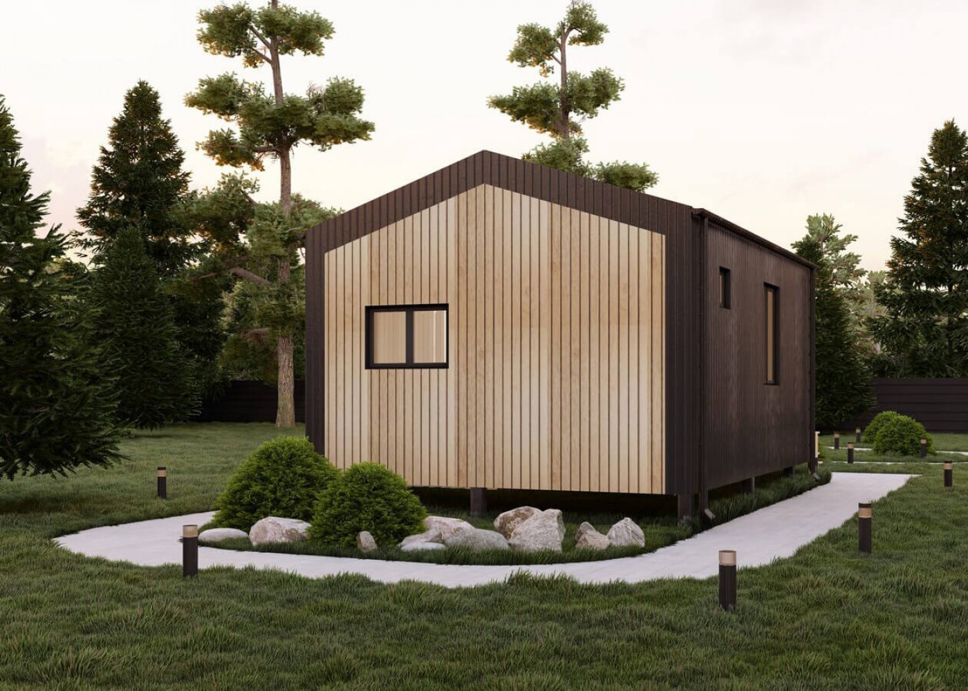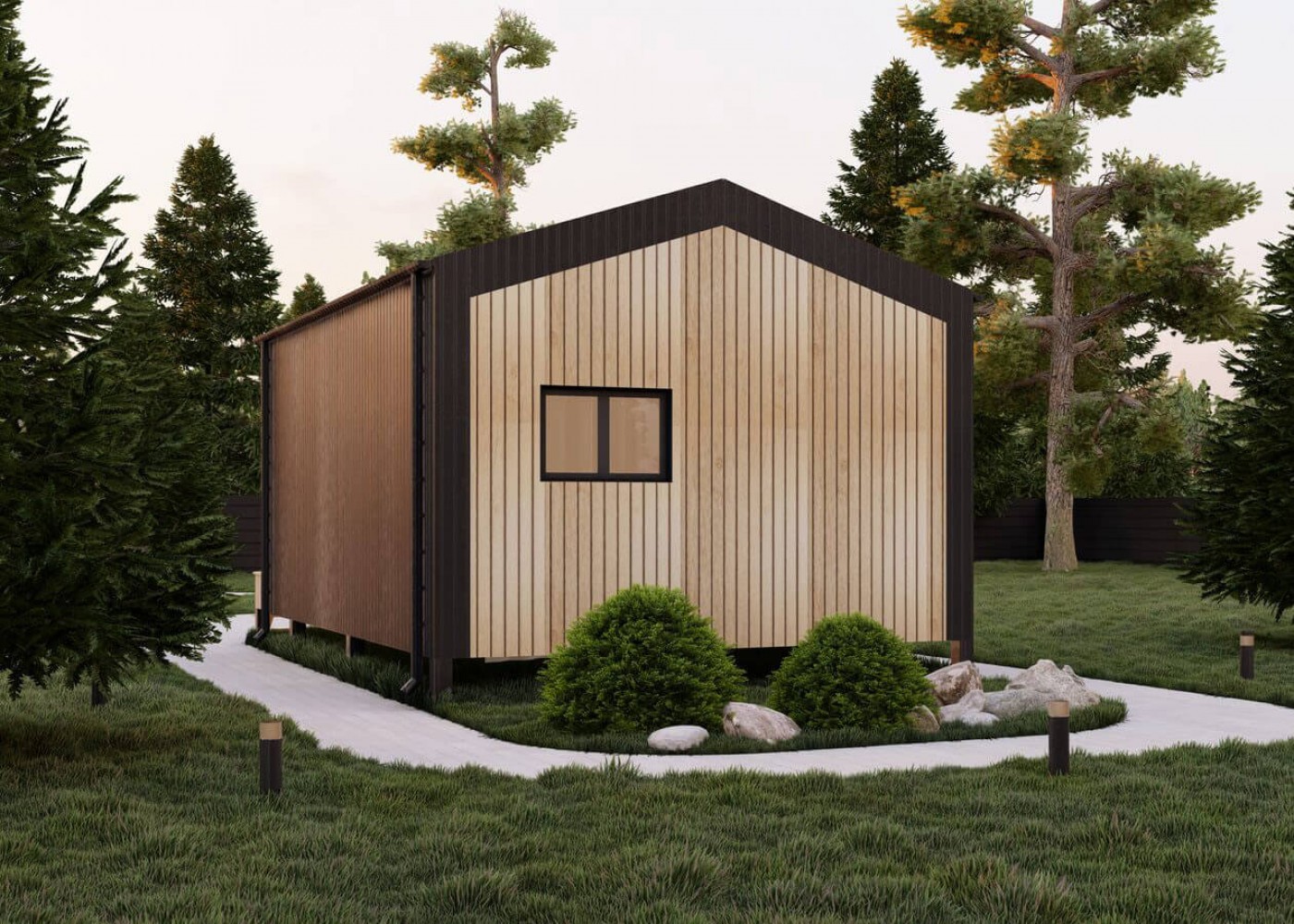 Внешняя отделка: фасады торцевые — планкен 20мм. Боковой фасад и кровля — профлист с21.